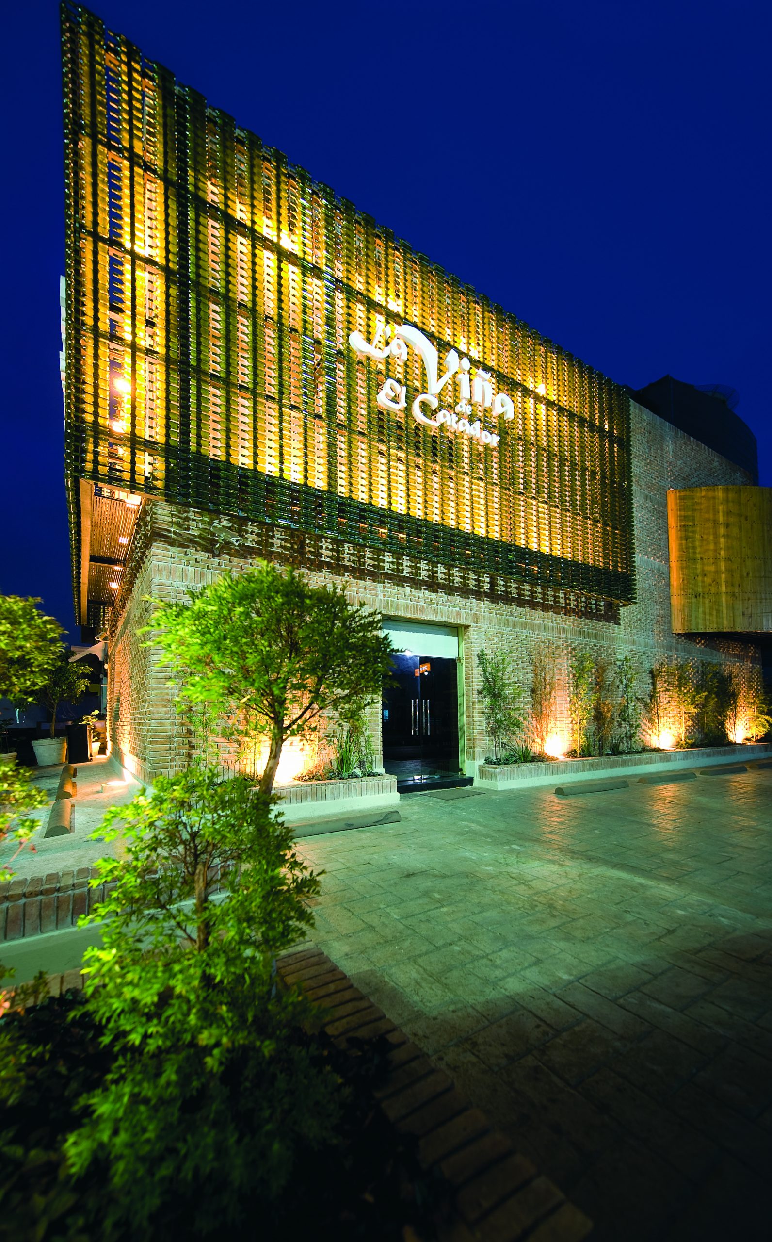 La tienda de vinos La Viña del Catador ofrece una interesante solución plástica que destaca por la sencillez de los volúmenes, la conjugación de los elementos y el corto tiempo de ejecución. La conceptualización del proyecto se basó en usar un recipiente arquitectónico con su envolvente para presentar el producto protagonista: el vino.