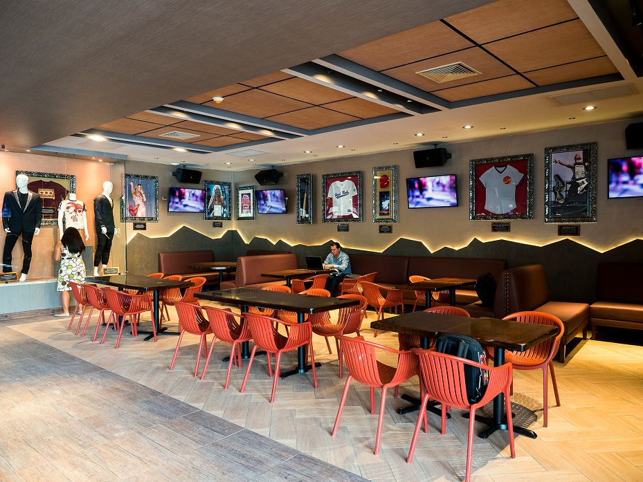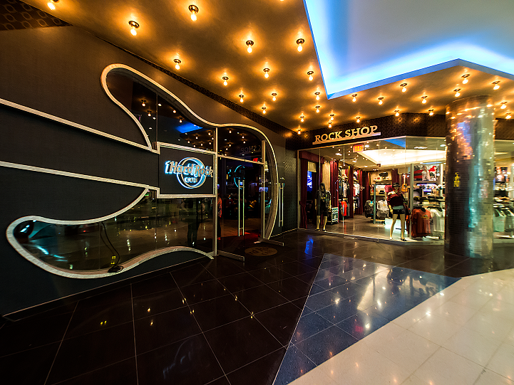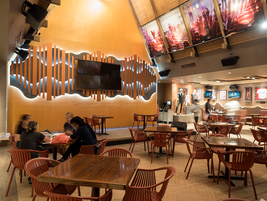 Diseño arquitectónico inspirado en la música, sus instrumentos y artistas. Cada elemento, cada color y textura están concebidos para que el público pueda disfrutar de la música, el ambiente y cultura del Rock que caracteriza a esta emblemática franquicia.